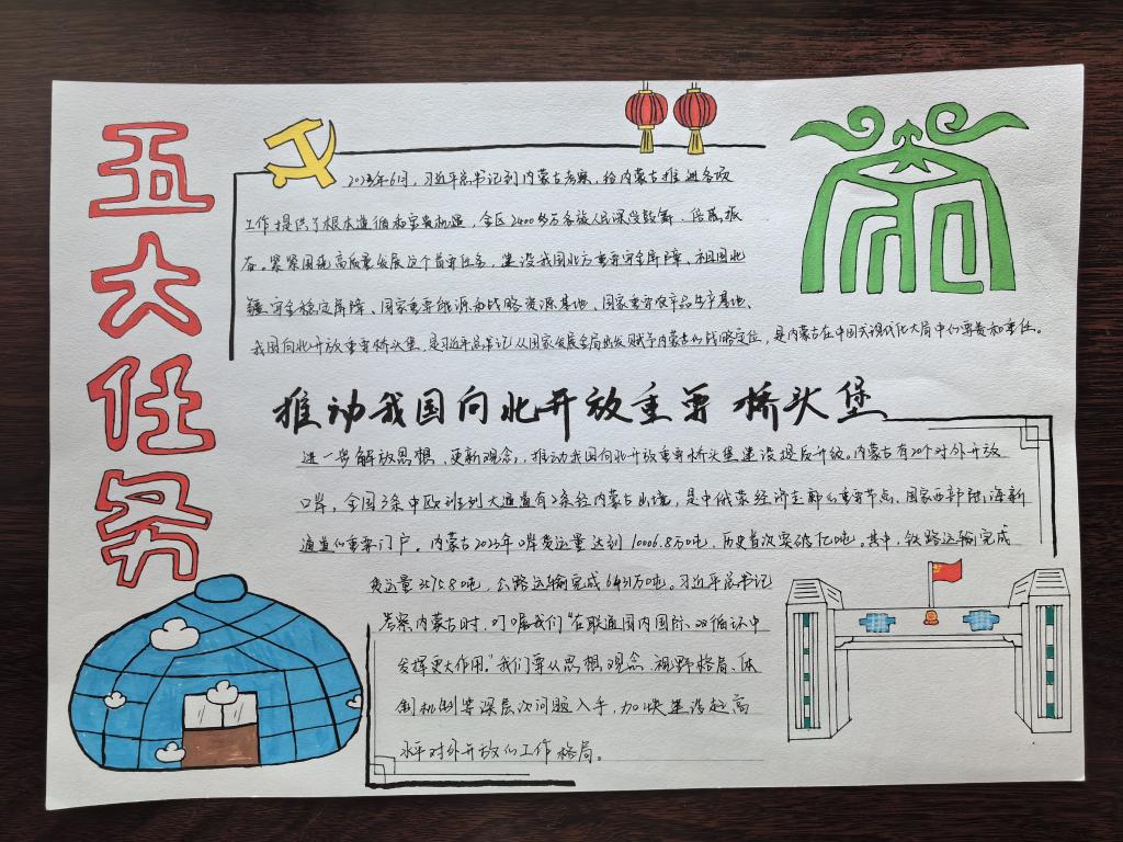 本次集中学习前分党小组进行准备,活动以绘制及分享海报形式进行,各小组分工明确,相互配合。会上,首先对《聚焦“五大任务”打造祖国北疆亮丽风景线》进行集中学习,后各小组结合海报分别针对五大任务进行内容分享。