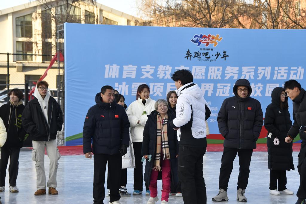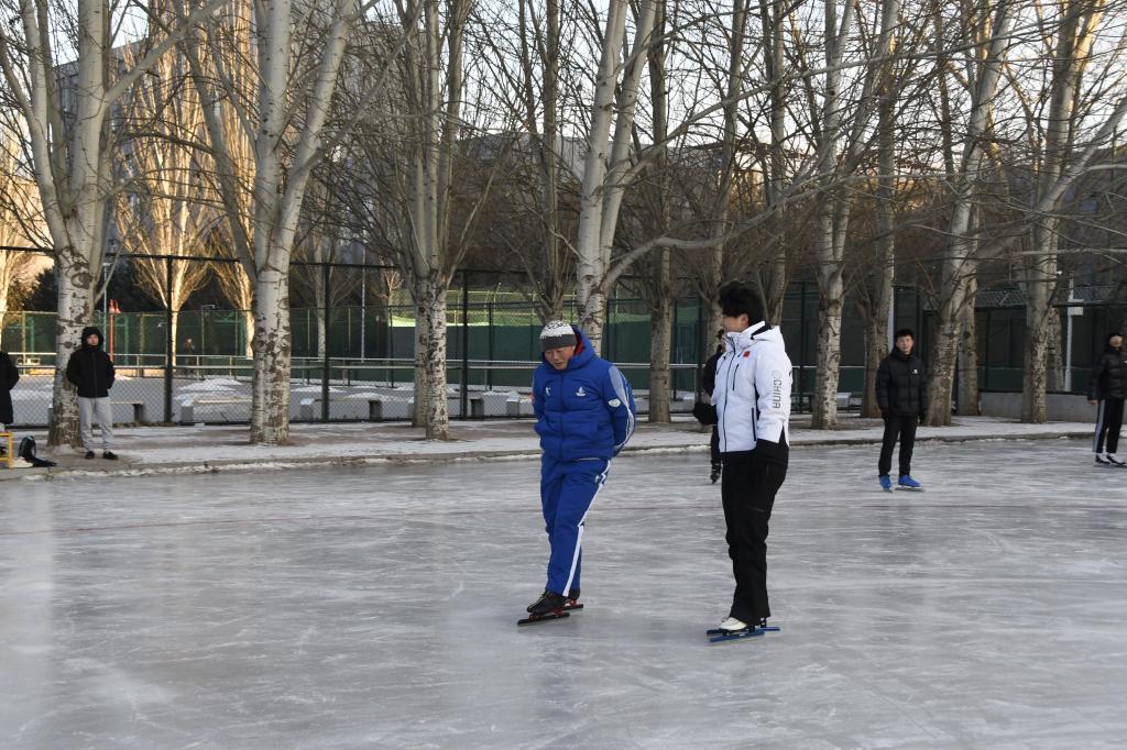 速度滑冰青奥世界冠军李岩哲现场教学,随后换上冰鞋同现场的师生一起练习。最后,两位世界冠军为大家进行签名,并合影留念。