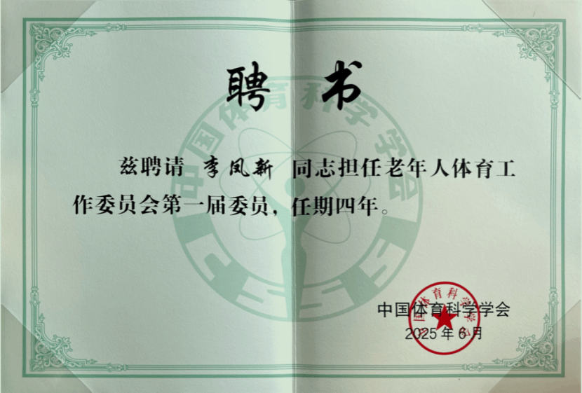 华体会平台,华体会(中国)副院长(主持工作)李凤新教授受聘为中国体育科学学会老年人体育工作委员会委员,任期四年。